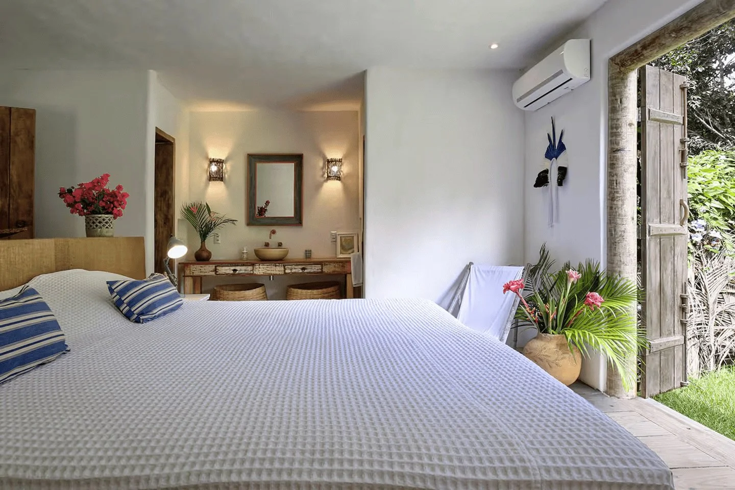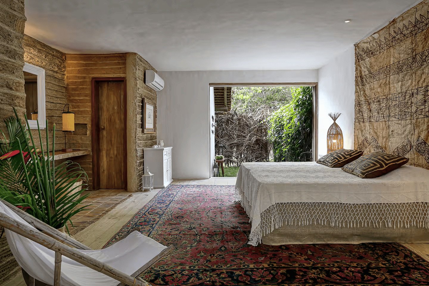 Experience the authentic heritage of Trancoso. This room features traditional Pau a pique walls and is adorned with kilim pillows and lampshades crafted by local artisans. Enjoy your own private garden for quiet morning reflections.