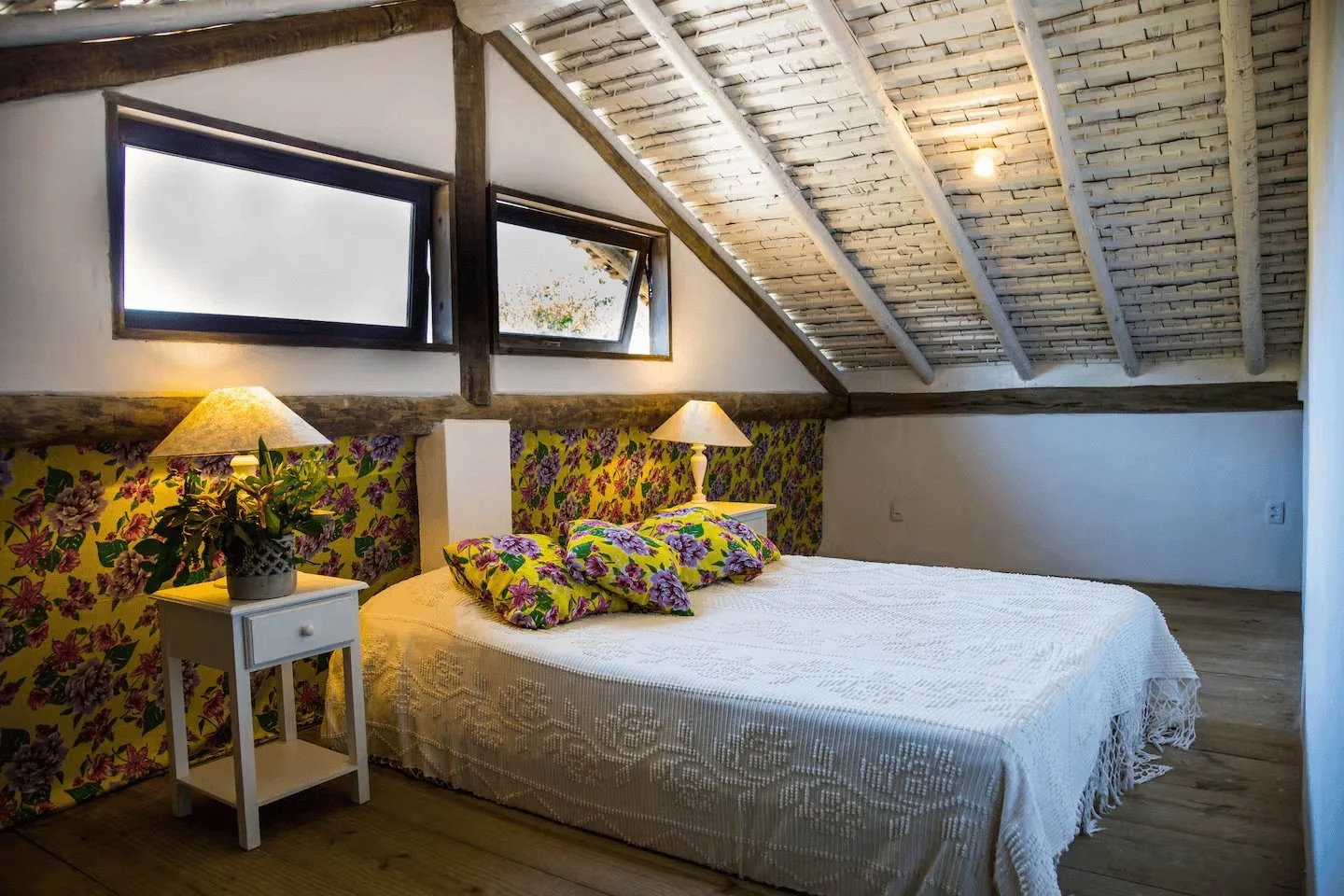 Mirroring the charm of the loft, this attic space is a quiet sanctuary with exposed wood ceilings. It is the perfect tucked-away spot for deep rest, sharing a bathroom with the adjacent attic room.