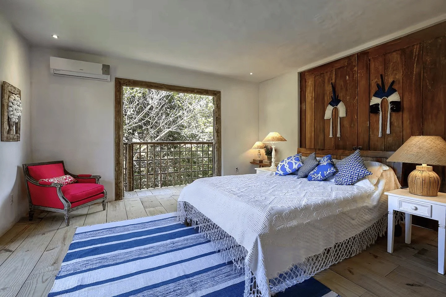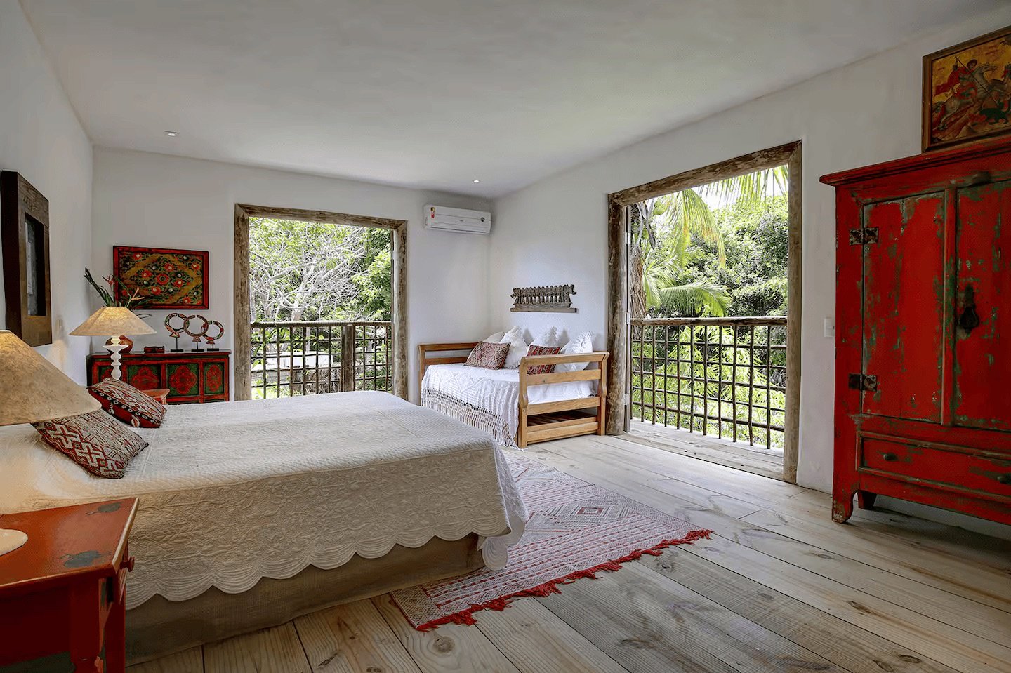 Located on the second floor, this light-filled room features a wooden daybed-style frame and two private balconies. This room shares a split-style bathroom with Bedroom 6